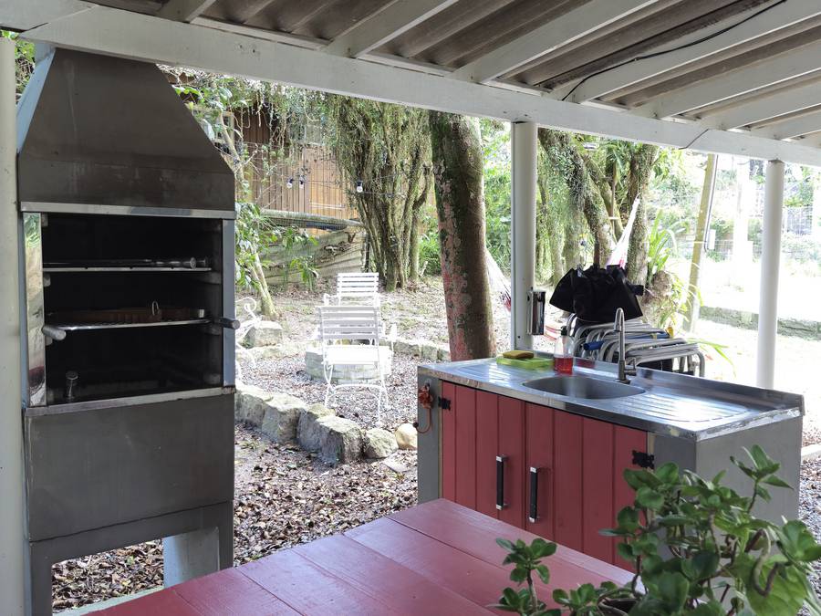 Ao lado, a churrasqueira garante momentos de sabor e descontração, seja para um almoço em família ou um jantar especial, espaço ideal para desacelerar e aproveitar o melhor da Guarda do Embaú.